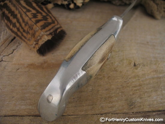 The Thick Elk Antler Inserts on this knife have dark Gnarly grain and they have been comfortably contoured. Still tight in the handle.