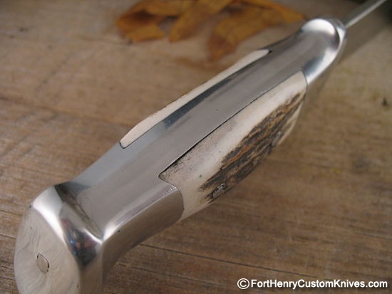 The Thick Elk Antler Inserts on this knife have dark Gnarly grain and they have been comfortably contoured. Still tight in the handle.