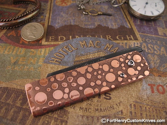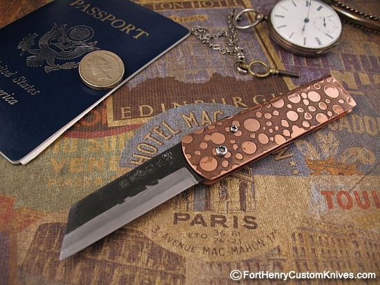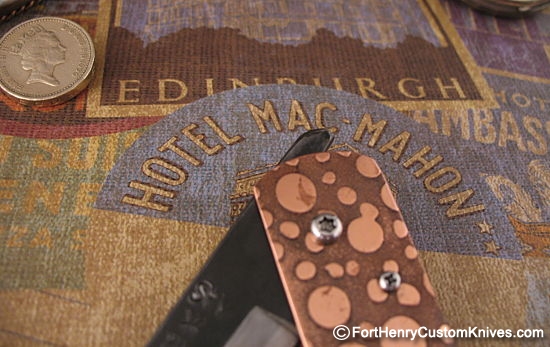 Takeda also crafted the thick Integral Copper handle with carved Bubble Accents that the knife folds into.