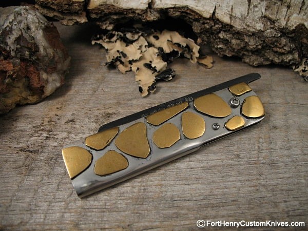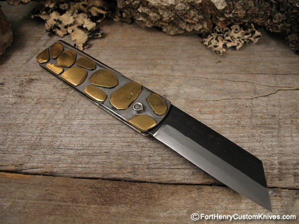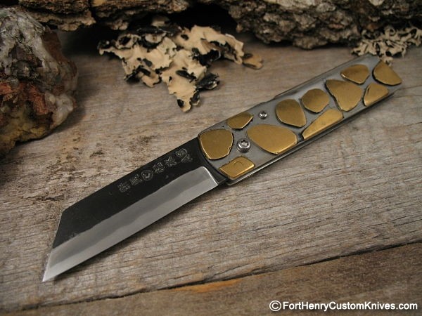 Takeda crafted the thick Stainless handle with Brass Accents that the knife folds into. He hand sculpted each Brass piece on the exterior which looks great but also adds grip enhancement.