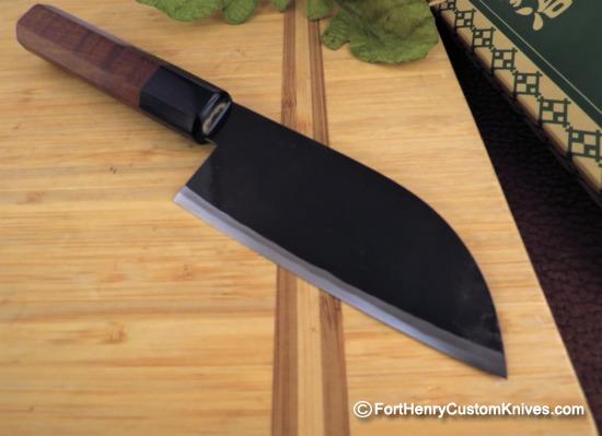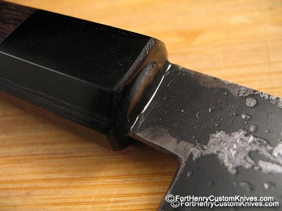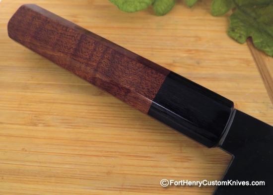 Takeda passes his Forged blades to another Master who completes the traditional Japanese handling process. This is the way that Japanese Swords and knives have been made for centuries. The Curly Maple Hard wood handle is Custom Contoured in an Octagon pattern.