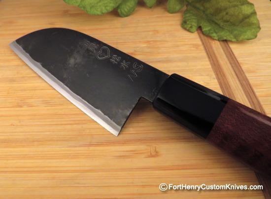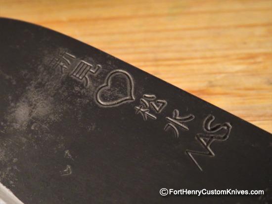 I have admired Shosui Takedas knives for many years. The Takeda Smithy was founded in 1920 and moved to Niimi in 1951. They produce hand-forged blades and tools such as kitchen knives, hunting knives, hoes, hatchets, etc. A third generation master blacksmith, Shosui Takeda specializes in hand forging blades from the highest quality carbon steel, Aogami Super Steel (AS), which has added Vanadium. The most recent blades are marked with “NAS” and Takeda’s Signature, all forged entirely by hand, as it has been done for generations. Each blade holds its edge extraordinarily well and resharpens easily.