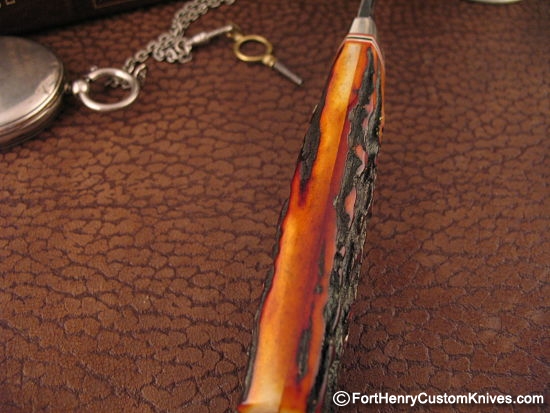Kansei added the gorgeous, Amber Sambar Stag handle scales and the Satin Finished Nickel Silver Guard. The handle provides a Full Grip ~ wonderful custom contouring.