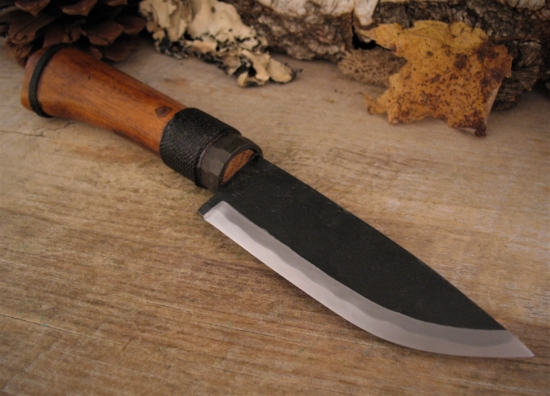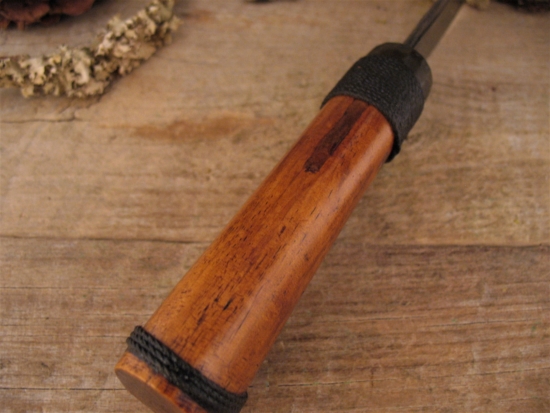 The Wooden handle is Cord Wrapped and the Cord and Hard Wood handle are coated with a waterproof Resin from a Poisonous plant. The knife also has a hand worked Iron Ferrule.