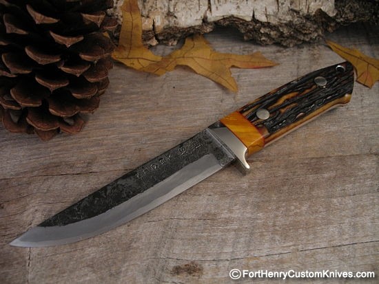 Takeda then passes the blade onto Takahashi who custom fits the amazing Amber Sambar Stag handles and NS Guards. On this knife Takahashi also added a rich colored natural Fire Amber Spacer and Red Liners for accent. One Master for each process, this is the way that Japanese Swords and knives have been made for centuries.