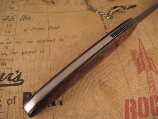 The Stabilized Cocobolo handle scales have Gorgeous Natural Grain and color. The Frame and Backspacer are thick Titanium. The Blade does slightly rub against the interior liner.