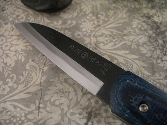 Master Takeda hand forged the blade for this from his Stainless Clad Aogami Super Steel blade ~ he left the Heat Treat Scale on the exterior to create a Kuro-uchi style finish.