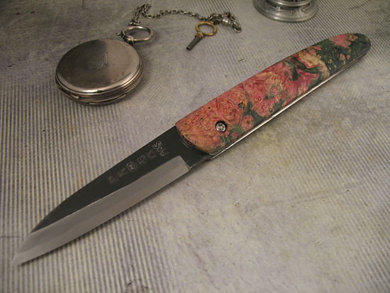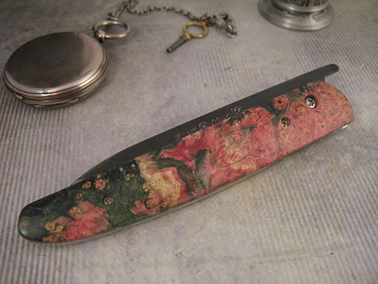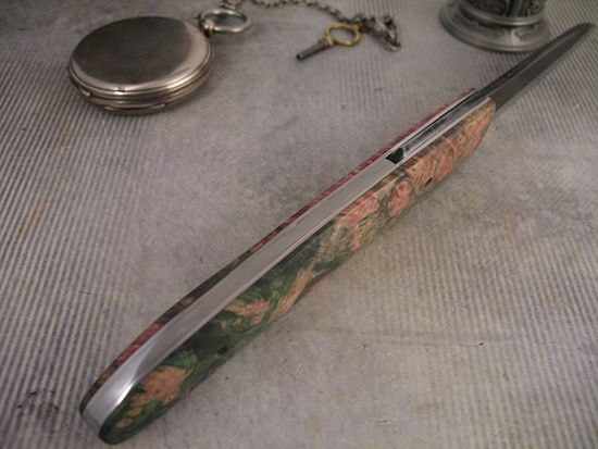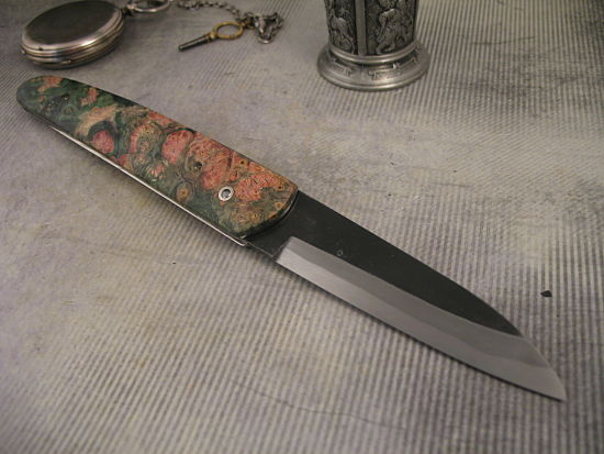 The Stabilized Box Elder handle has a beautiful range of colors ~ lots of Deep Grain. The Frame and Backspacer are thick Titanium.