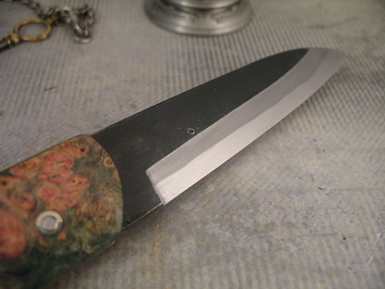 The Lamination Line is clearly visible and the blade was hand sharpened on increasing grits of natural Japanese Waterstones by Takeda to a laser sharp edge.
