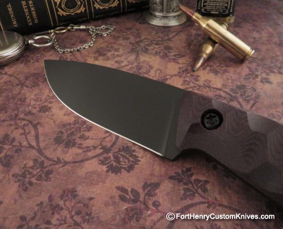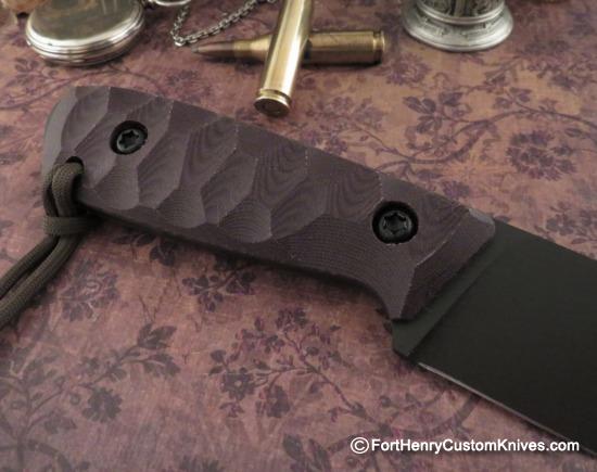 The Handle Scales are a supremely Tough Forest Brown Micarta that have a Custom Hand Sculpted Surface texture for an enhanced grip. The Scales are attached with Torx Screws and Michael gave the the handle a Contoured Hand Filling Shape.