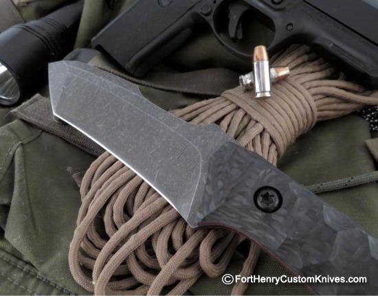 The Handle Scales are a supremely Tough but Lightweight Carbon Fiber that have a Custom Hand Sculpted Surface texture for an enhanced grip. The Scales are attached with Torx Screws and Michael gave the the handle a Contoured Hand Filling Shape.