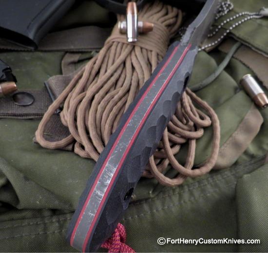 The Handle Scales are a supremely Tough Black Micarta that have a Custom Hand Sculpted Surface texture for an enhanced grip. The Scales are attached with Torx Screws and Michael gave the the handle a Contoured Hand Filling Shape.