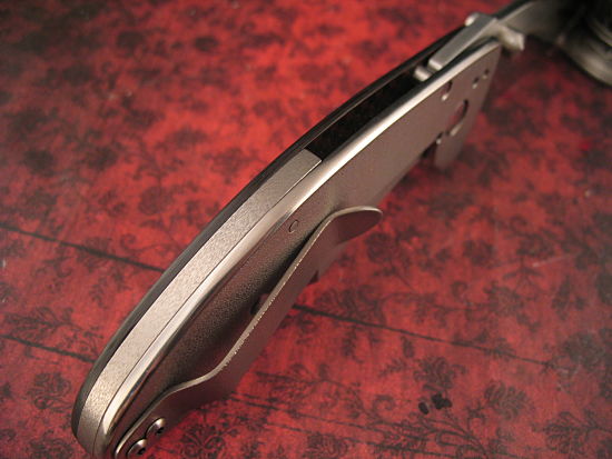 With a beautifully ground CPM-154 blade and a full Titanium reverse side with Tom’s special Orange Peel finish, this knife is slim and stout.