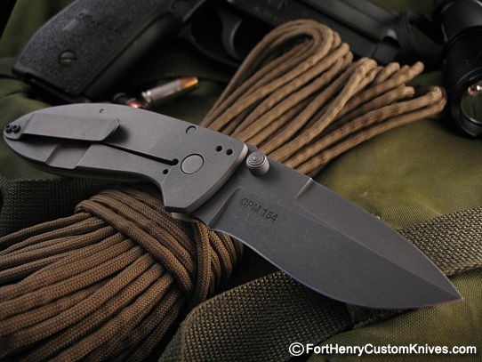 The G-10 scale has a nice Bead Blast finish which adds a nice Lizard Skin type appearance and texture. A new uniquely ground Recurve blade with Full False Edge of CPM-154CM steel which has a custom Tough Glass Bead blast finish.  Dual Thumb Studs for reverse carry.