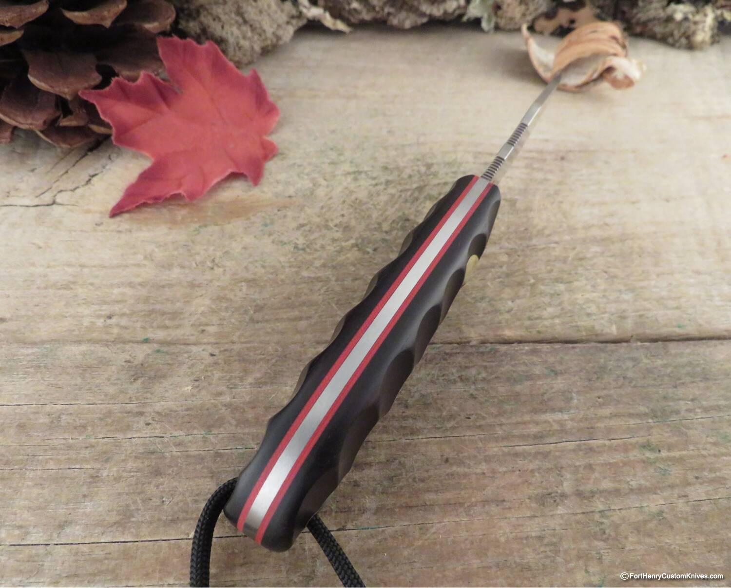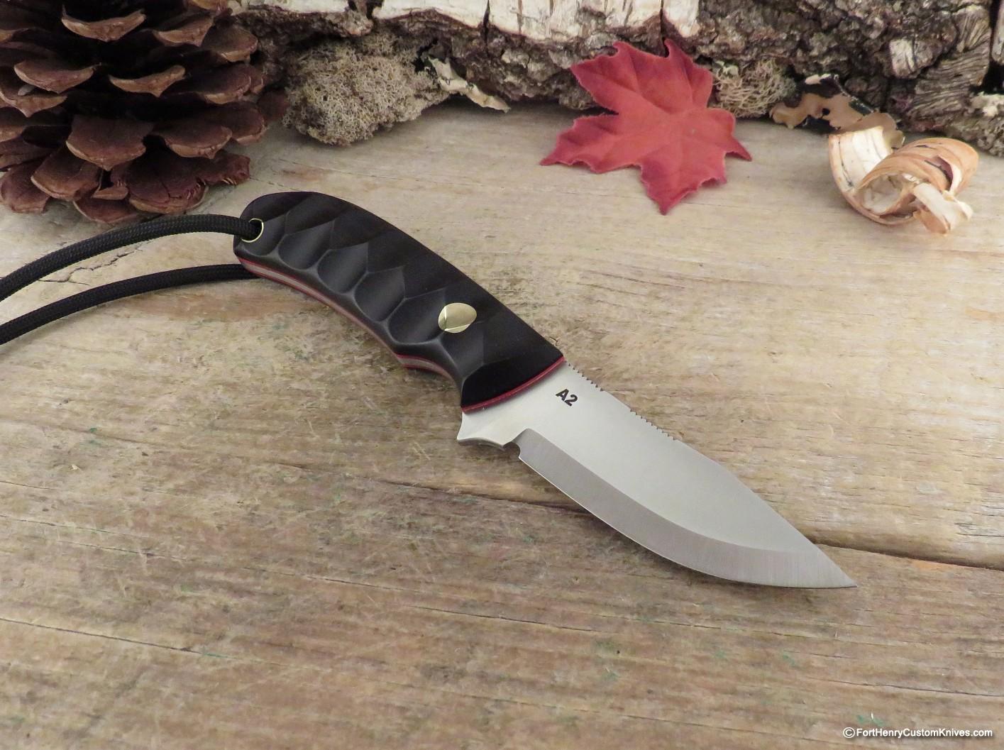 This is a Full Tang knife with Custom Black Liners and Stabilized and Textured Blackwood Handle Scales Complete with a Lined Thong hole.