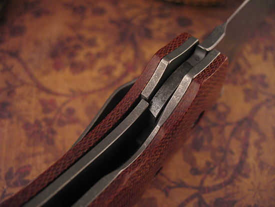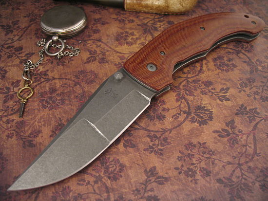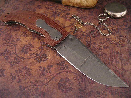 The Handle Scales are contoured brown canvas micarta and the beautiful CPM3V Compound ground Recurve blade compliment each other well. The Razor Sharp blade is perfectly centered when closed. Dual Thumb Studs for reverse carry.
