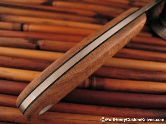 The full grip handle is extremely comfortable, a mid point swell helps to fill the palm and makes a very secure grip. The scales are Stabilized Wood with Black Liners and a Single Mosaic Pin. Signature Stainless lined oversized Thong hole.