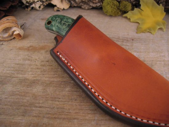 Complete with a Lined Thong hole. The Thick A2 Steel Blade has a Long Cutting Edge with a Scandi Grind for easy Edge Touch ups.