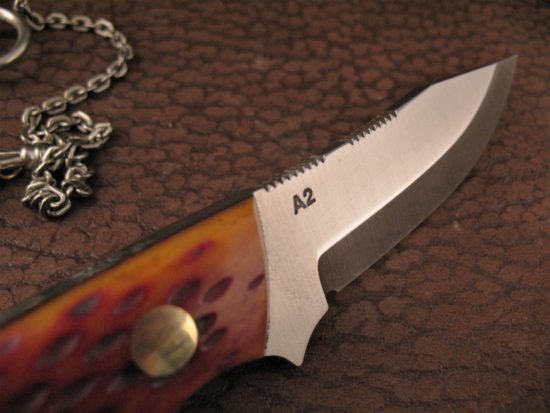 This design has a modified Harpoon style blade in an uncommon High Carbon A2 Steel