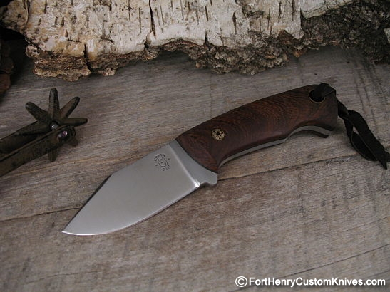 This is Tom’s PSK – a stout Full Tang knife is made from A2 Steel with a Full Flat Ground blade. Custom Ordered with some beautiful Stabilized Desert Ironwood, extremely well matched ~ Mosaic Pin, Thick black Liners and Leather Thong.
