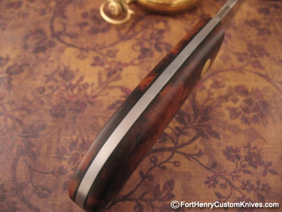 Hand Crafted from the toughest handle materials, great looking Stabilized Ironwood with Full Black Liners and Custom Thumb Ridges on the Spine.