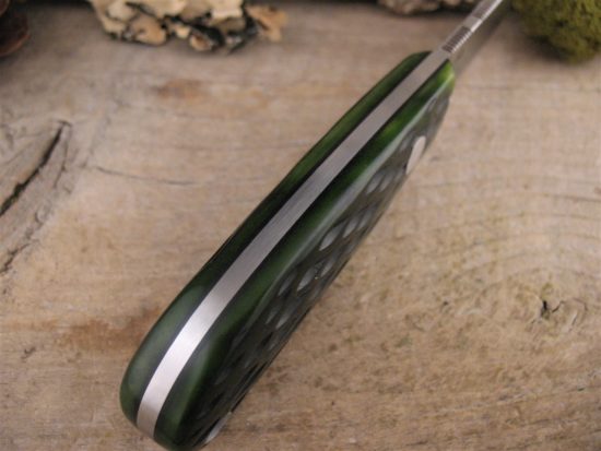 Hand Crafted from some Excellent Ol’Time Green Jigged Bone with Full Black Liners and Custom Thumb Ridges on the Spine.