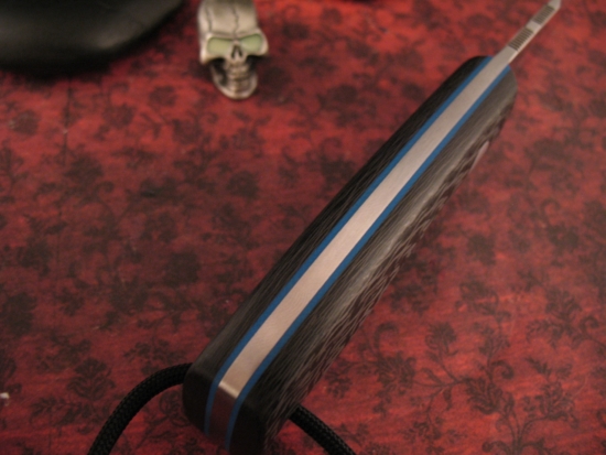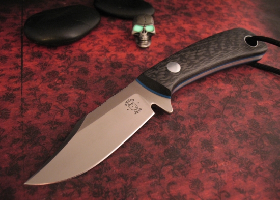 The Mini Bowie has a beautifully executed Bowie shaped blade but what I like most about this knife is the handle design that Tom has given this model. A nice swell at the rear of the handle and all four fingers find a secure place without being cramped.