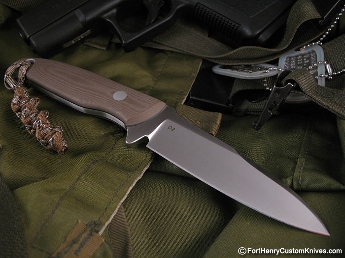 A tough Full Tang knife with thick Black liners and special Glass Blasted Tan Canvas Micarta handles which have a great grip, signature oversized Thong hole wtih Free Matching Custom Paracord Lanyard by Katie.