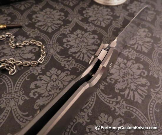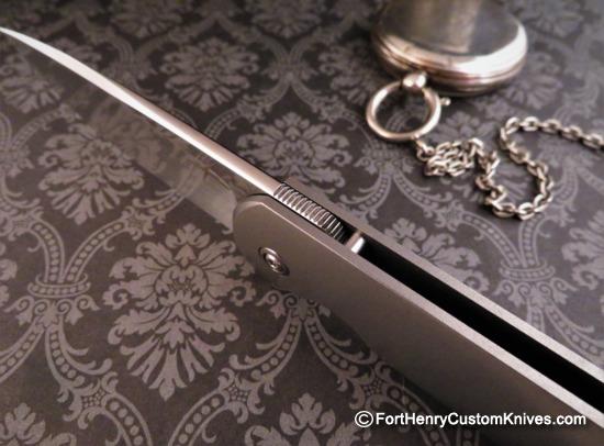 A Screwless, Low Rider Titanium Clip is set for Tip Up Carry ~ this knife will ride nearly Out of Sight. The Reverse Oversized Custom Pivot Collar also acts as a Lock Stop Overtravel.