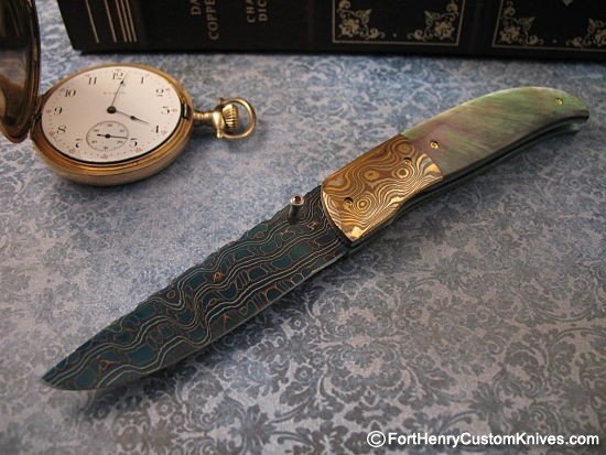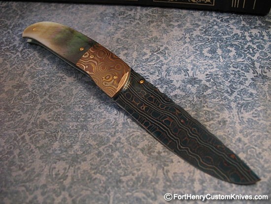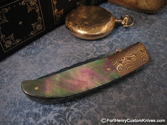 The Bolsters are Mokume by Chad Nichols and for a knife of this caliber George chose his most select absolutely Stunning Black Lip Pearl handles!