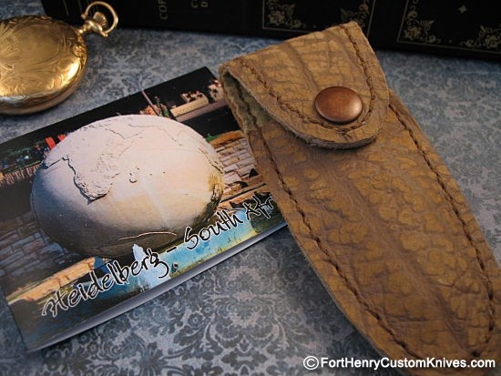 This knife comes with an exotic Cape Buffalo Leather pouch sheath built for Right Hand belt carry. Also a Color Certificate of Authenticity which details all components is included.