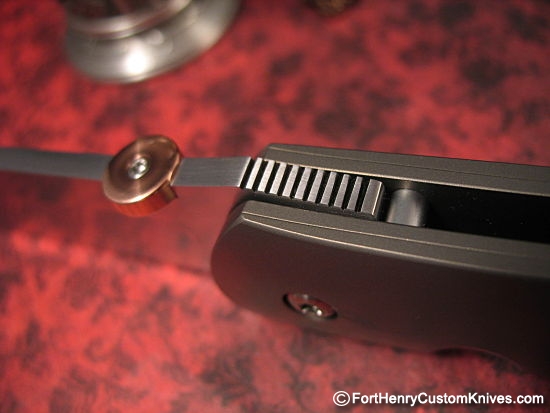 The S35VN Hand Rubbed blade is smooth as butter to open. Perfect lock up, early and tight. John also added a custom Copper Thumb disk (to match the Lightening Strike CF) and Thumb Ridges.