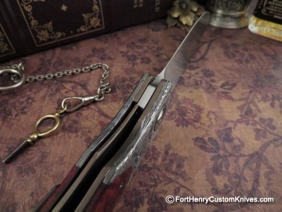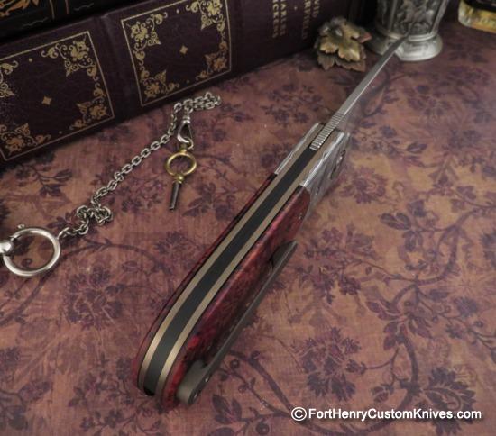 The blades on these Trevor Burger LEXK flippers was Hand Ground from tough M390 which Trevor gave a Labor Intensive Hand Rubbed finish.  The handles are Stabilized Burl with Gorgeous Damasteel Bolsters. This design has wonderful Balance and due to the Internal Bearings ~ the Action is Incredible.