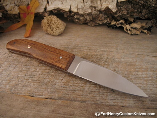 The design is one that could be easily and discreetly carried and has renough blade length for any small daily chore. A very comfortable handle design due to the “drop” in the rear of the handle, hand crafted with beautiful materials.