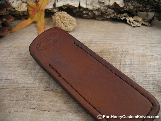 Provided with a thick, extremely well finished Leather Pouch Sheath, (No Belt Loop) that allows the knife to sit low inside the sheath.