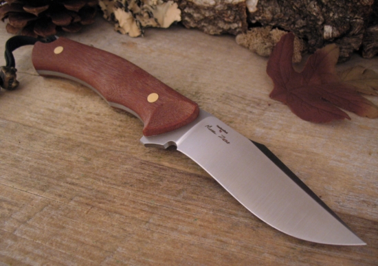 This knife has a sleek appearance but the Wide NitroV Blade is tough enough for any Camp or Hunting Chore. The Flat Ground Blade was Hand Ground and Michael gave it a Dual High Satin Custom Finish.
