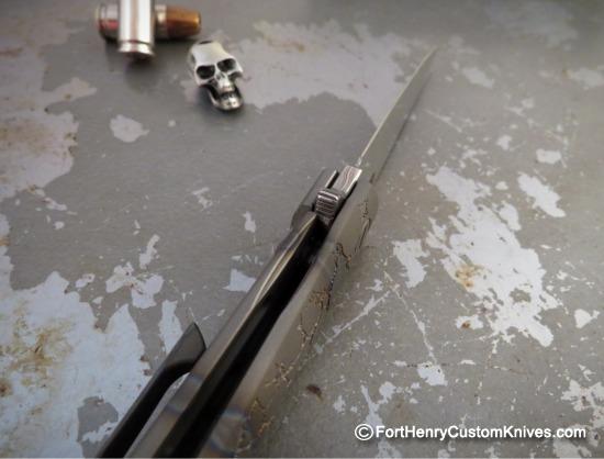 The Open Frame Construction sports a Custom Silver “Pile of Skulls” Backspacer make this a Very lightweight knife.