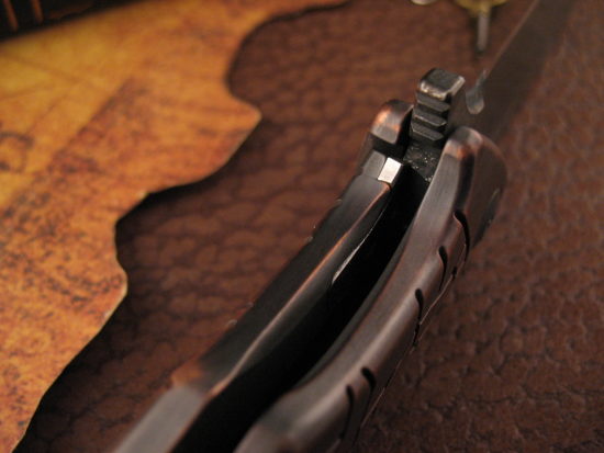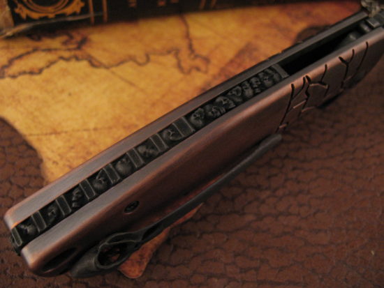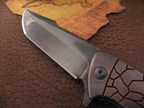 This S4 has an Aggressive Harpoon Style blade grind!  It is both Classy and Utilitarian at the same time, the Titanium Frame has a unique Two Tone Copper finish.