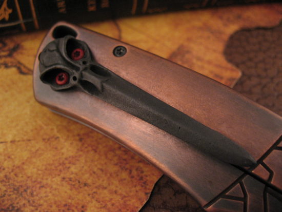The knife has a Near Full Length “Momento Mori” Pile of Skulls Cast Backspacer that adds Strength to the frame and it extends just above the Frame to aid in grip retention. Marked “Momento Mori” on the inside.