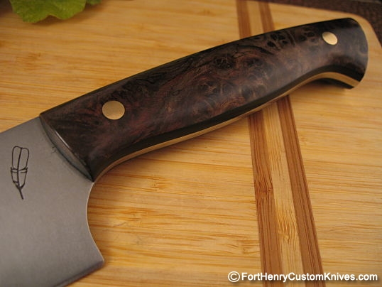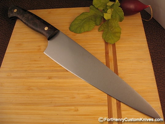 This is a Custom Chef’s knife with a definite European Flare but made Entirely in the US. This knife would serve the Cook for any type of Cutting or Slicing on all types of Meat, Fresh Vegetables or General Kitchen Prep.