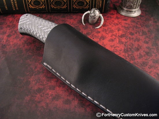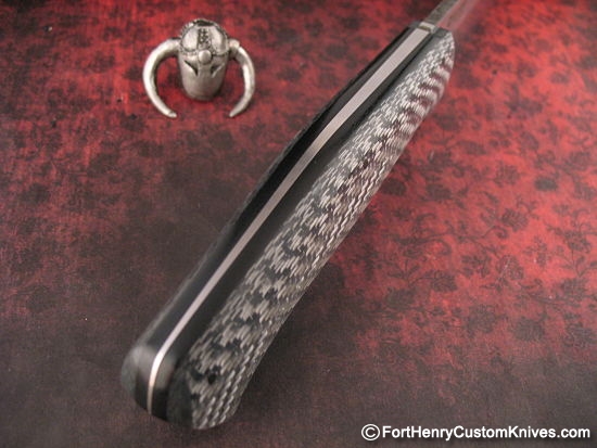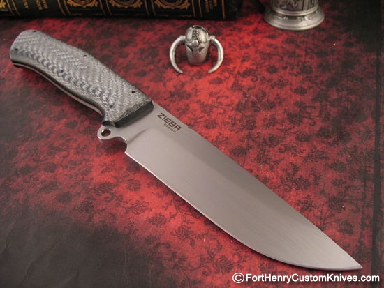 This is a Full Tang Hunter with a wonderfully comfortable Custom Contoured Handle of Silver Twill Carbon Fiber with a Thick Black G-10 underlayer. This special knife also has a Deeply Tapered Tang (something VERY few Makers do any more).
