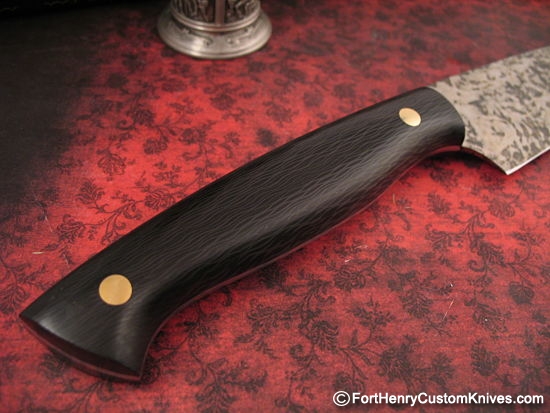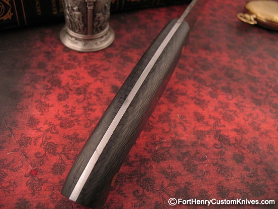 This is a Full Tang Chef’s Knife ~ the handle scales were cut from a single block of “Blackwood” Carbon Fiber.  The Scales were Linear Cut and left Thick, but then wonderfully custom contoured for comfort.
