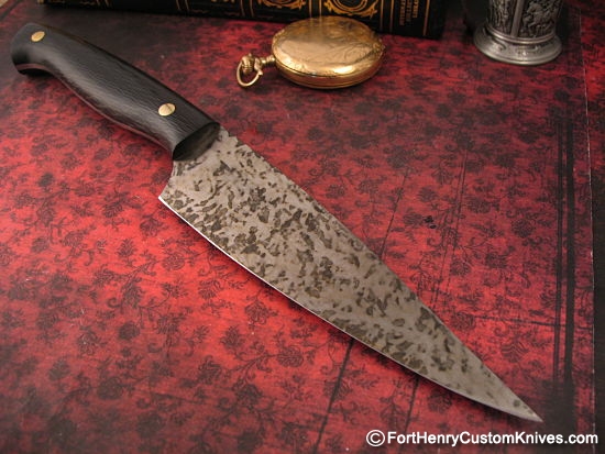 This is a Custom Chef’s knife with a definite European Flare but made Entirely in the US.  This knife is guaranteed to slice like a Light Saber!  It would serve the Cook for fine Cutting or Slicing on all types of Fresh Meat or Fresh Vegetables during General Kitchen Prep.