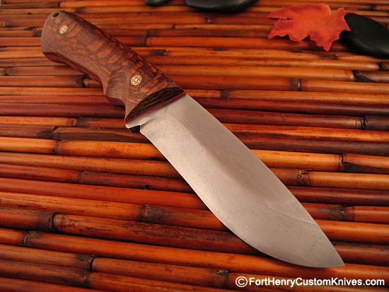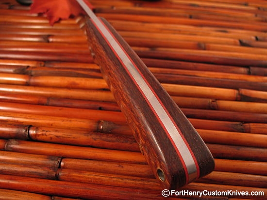 The Stabilized Afzelia Burl handle has beautiful Natural coloring and tons of grain. It is thick and nicely contoured with a Forward Finger placement area on each side of the handle, the Red Liners and Mosaic pins certainly add more eye appeal.