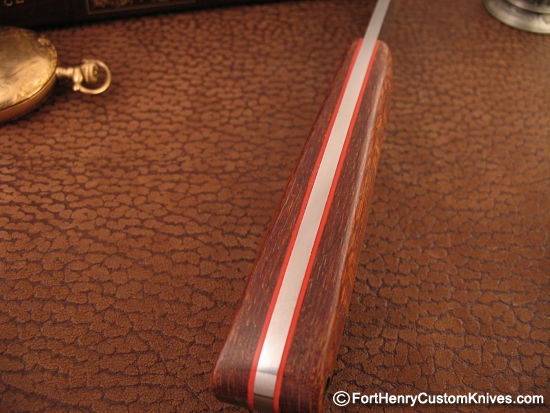 The Stabilized Afzelia Burl handle has beautiful Natural coloring and tons of grain. It is thick and nicely contoured with a Forward Finger placement area on each side of the handle, the Red Liners and Mosaic pins certainly add more eye appeal.