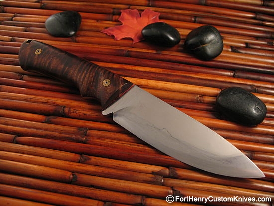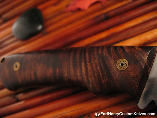The dark Stabilized Curly Maple handle has beautiful natural color and grain, it is nicely contoured with a Forward Finger placement area on each side of the handle, the Red Liners and Mosaic pins simply add eye appeal.